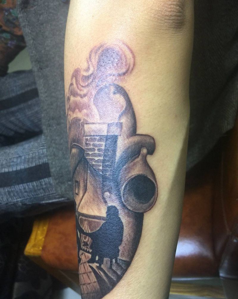 • T包小腿吹火男+阿多福纹身图片_腿部老传统新传统吹火男阿