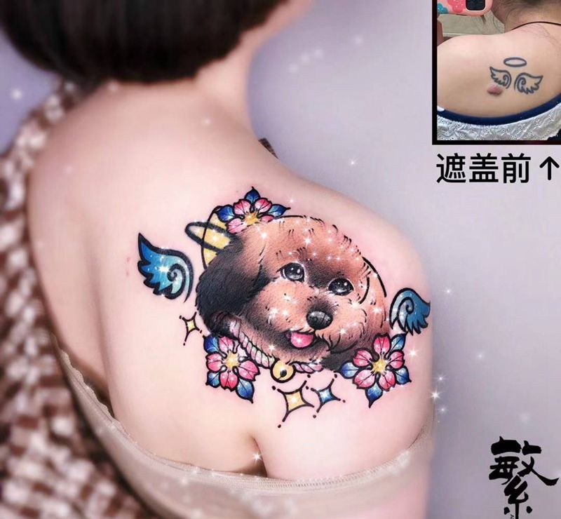当前位置: 首页 >江苏省苏州市纹身店-苏州繁花艺术刺青纹身图案>New school狗纹身图片_肩部New School狗翅膀花纹身图案
