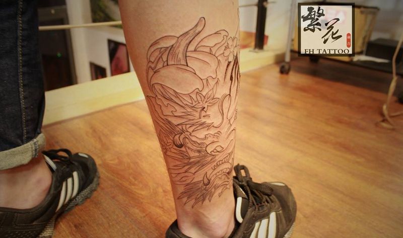 • T网红王老大花腿龙纹身图片_腿部新传统纹身图案