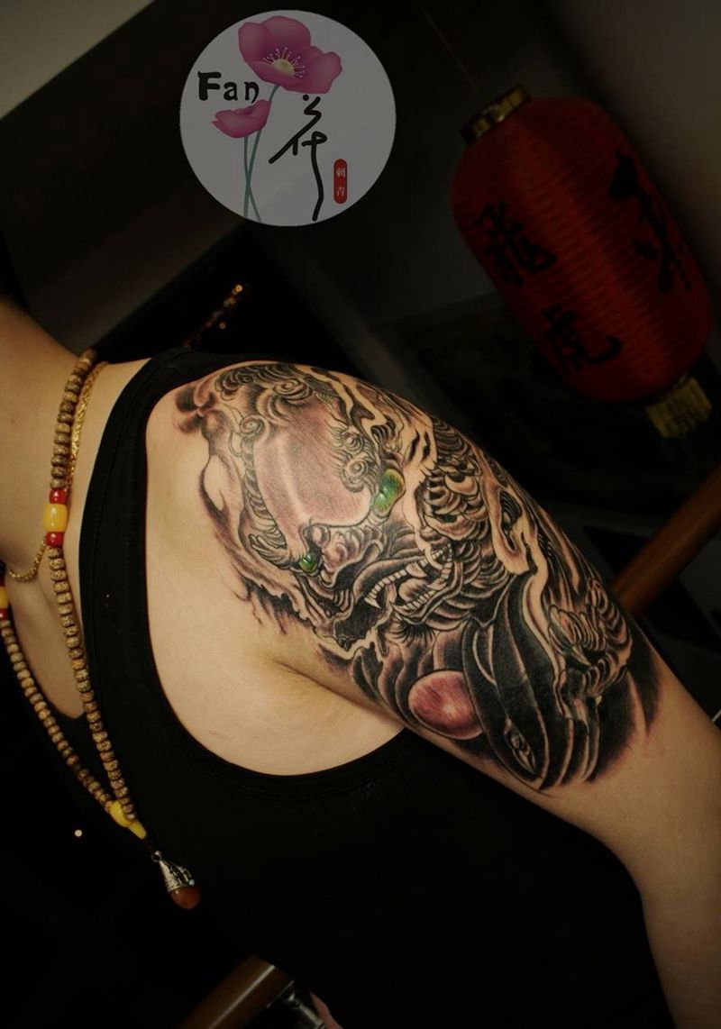 大臂唐福狮。遮盖纹身图片_肩部成品手稿传统动物国画手臂纹身图案