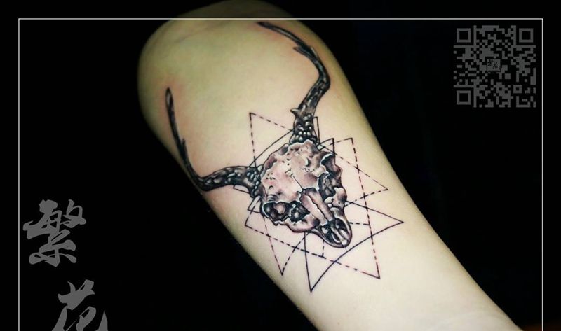 鹿头骨纹身图片_手臂成品手稿动物鬼神欧美几何原创纹身图案