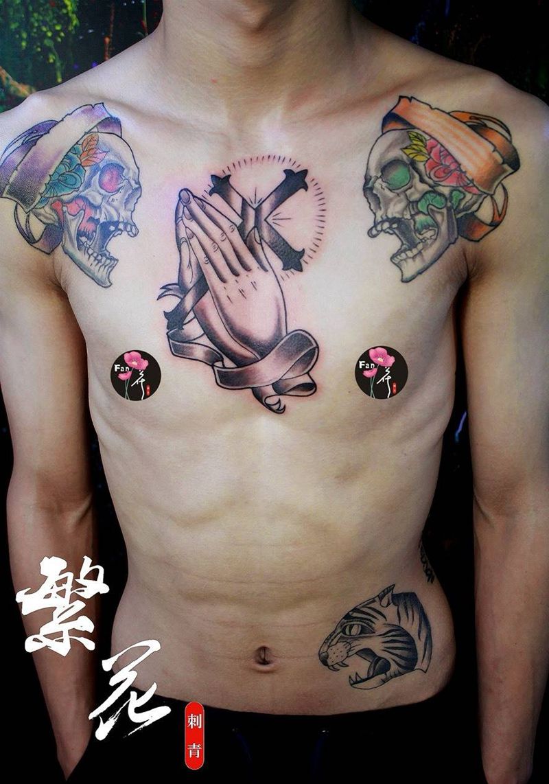 当前位置: 首页 >江苏省苏州市纹身店-苏州繁花艺术刺青纹身图案>祈祷之手纹身图片_成品手稿胸部传统肖像写实鬼神纹身图案