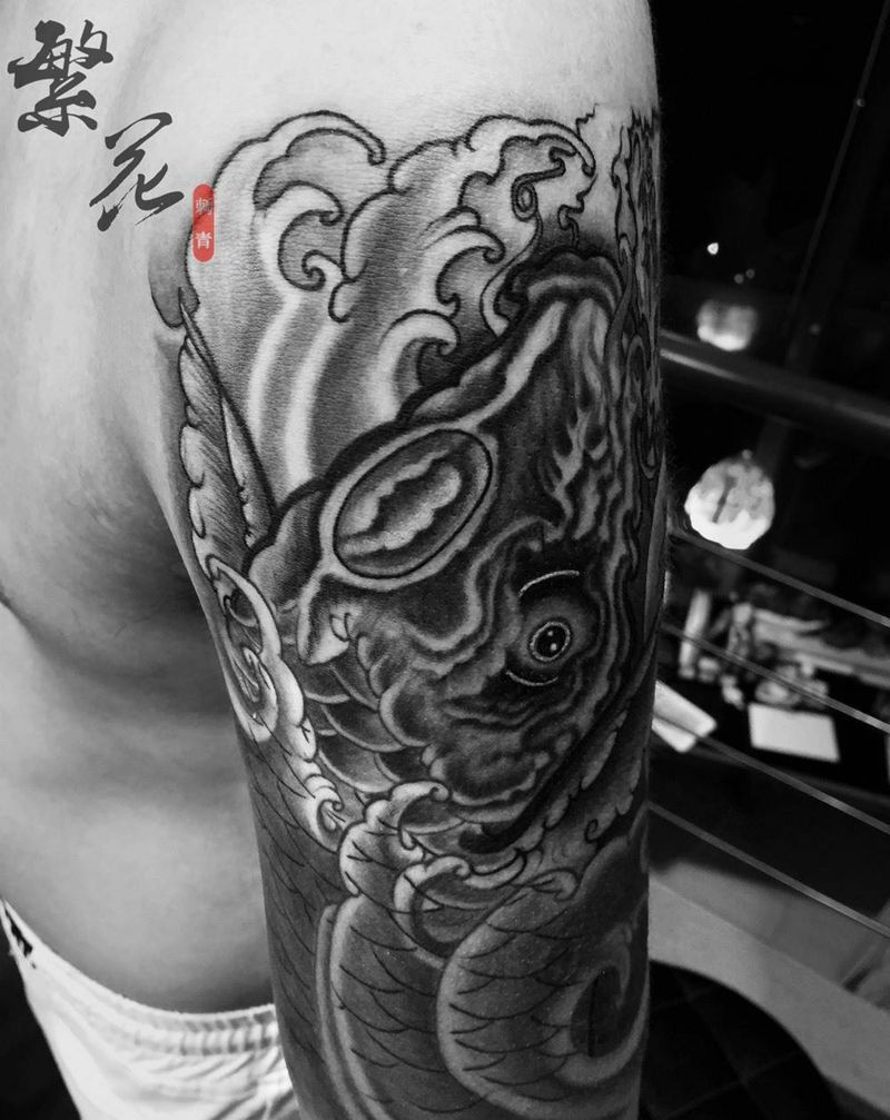 当前位置: 首页 >江苏省苏州市纹身店-苏州繁花艺术刺青纹身图案>新传统锦鲤纹身图片_成品手稿手臂手部传统写实国画动物纹身图案