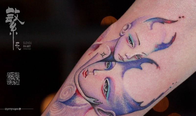 当前位置: 首页 >江苏省苏州市纹身店-苏州繁花艺术刺青纹身图案>双子座 星座纹身纹身图片_成品手稿手臂手部欧美写实人物纹身图案