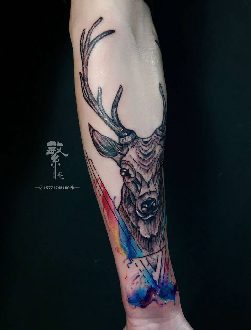泼墨鹿纹身图片_成品手稿手臂手部清新欧美泼墨动物静物纹身图案