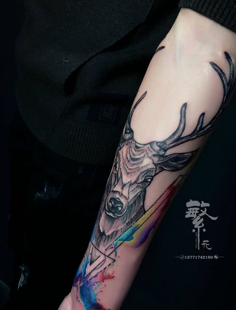 当前位置: 首页 >江苏省苏州市纹身店-苏州繁花艺术刺青纹身图案>泼墨鹿纹身图片_成品手稿手臂手部清新欧美泼墨动物静物纹身图案