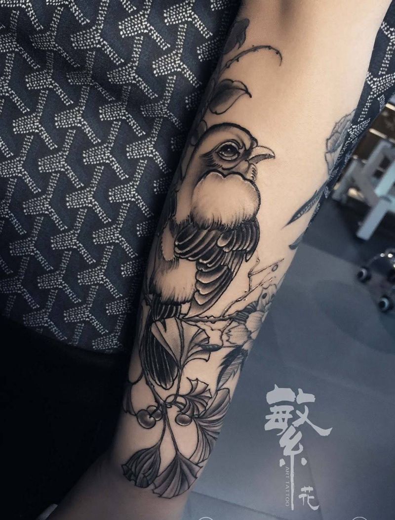 鸟 花纹身图片_成品手稿手臂手部国画写实植物动物静物纹身图案