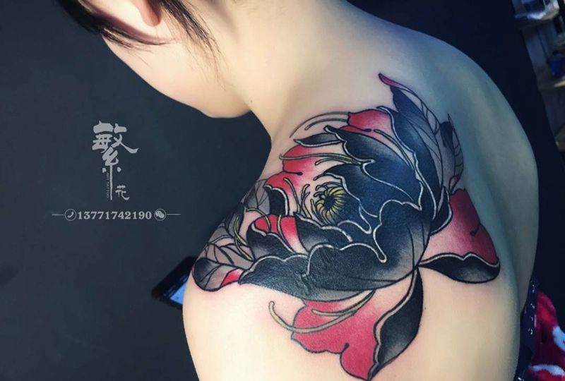 牡丹花 遮盖旧纹身纹身图片_成品手稿背部肩部欧美静物植物纹身图案
