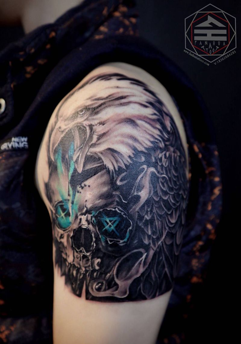 当前位置: 首页 >江苏省苏州市纹身店-苏州繁花艺术刺青纹身图案>鹰&骷髅纹身图片_成品手稿手臂欧美写实动物原创纹身图案