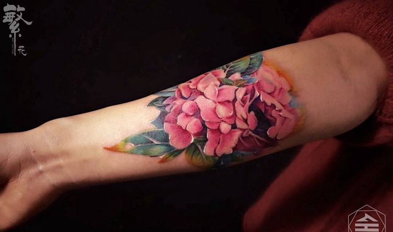 当前位置: 首页 >江苏省苏州市纹身店-苏州繁花艺术刺青纹身图案>唯美绣球花纹身图片_成品手稿手臂清新植物原创纹身图案