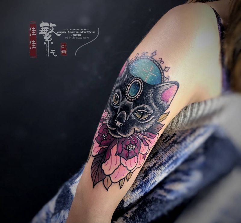 喵遮盖纹身图片_成品手稿手臂欧美动物旧遮盖猫纹身图案