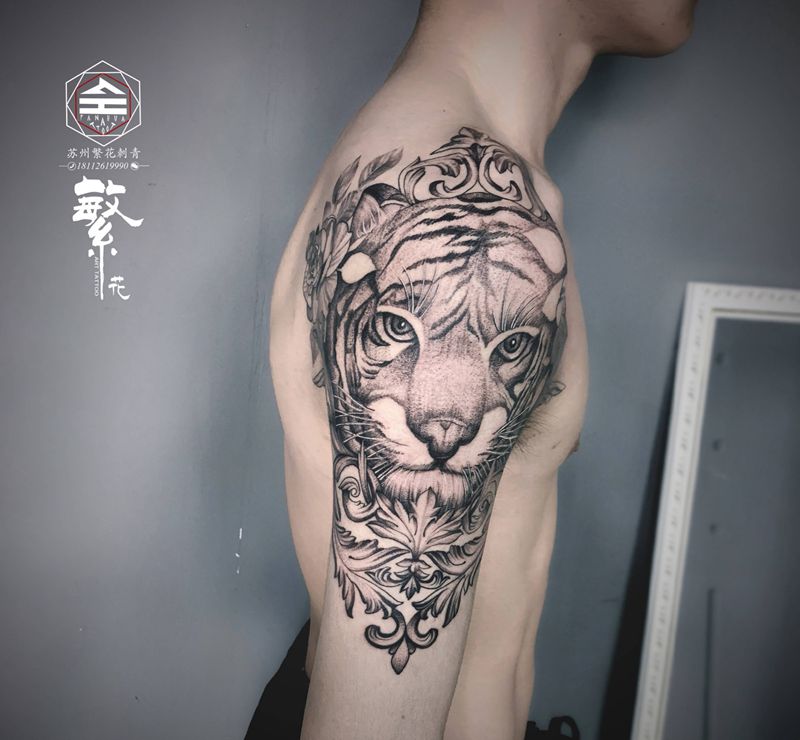 当前位置: 首页 >江苏省苏州市纹身店-苏州繁花艺术刺青纹身图案>老虎 花藤纹身图片_肩部手臂点刺图腾老虎纹身图案