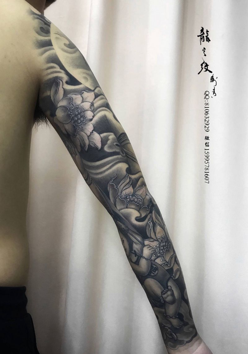 文殊菩萨和童子花臂纹身图片_成品手臂传统人物宗教原创龙之纹刺青苏州纹身图案