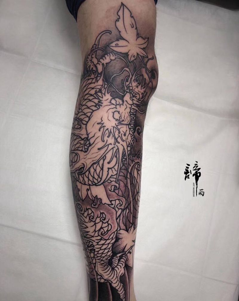 • T网红王老大花腿龙纹身图片_腿部新传统纹身图案
