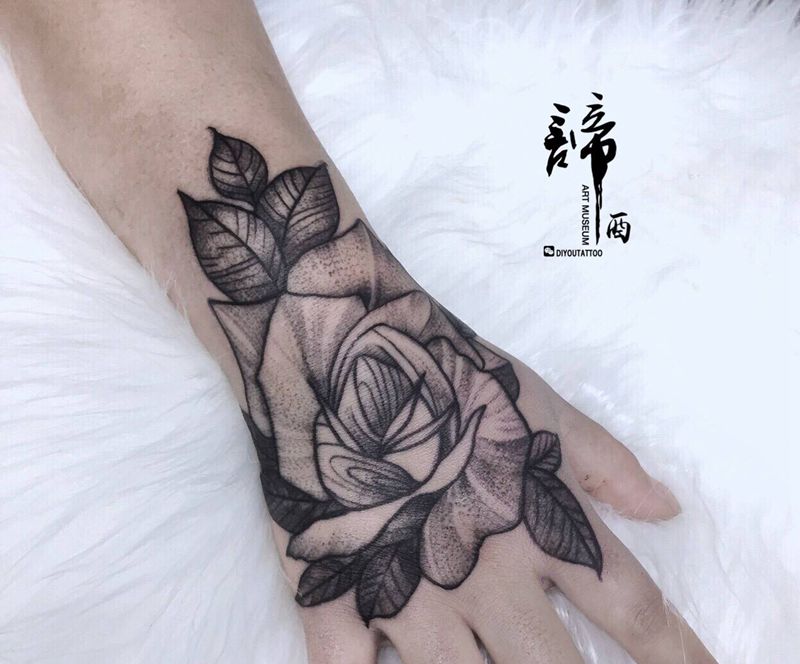 • 手背潮流时尚的玫瑰花眼睛纹身图案