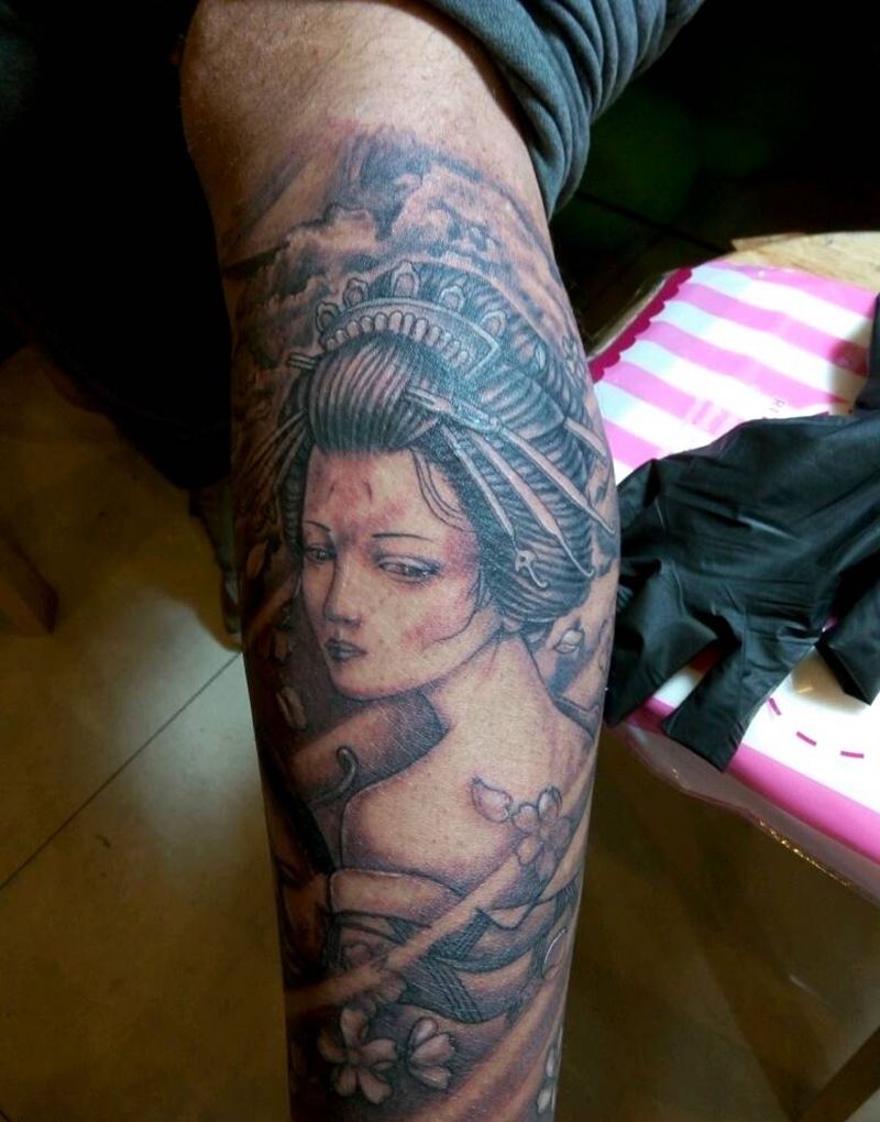 艺妓纹身图片_腿部传统肖像人物成品纹身图案
