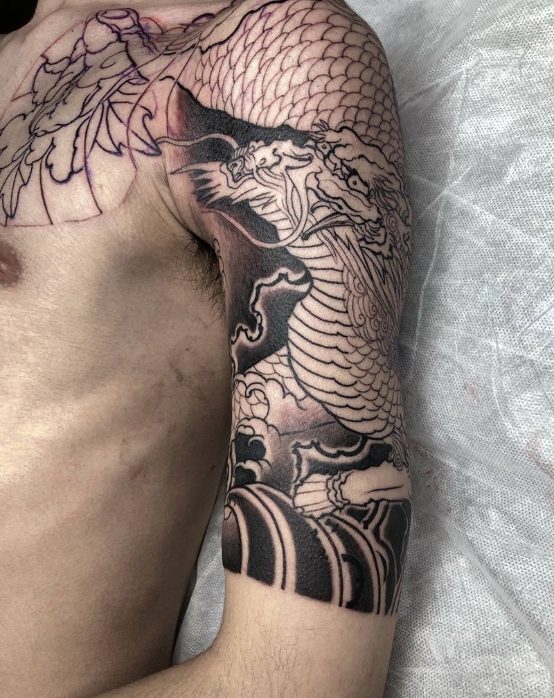 • T网红王老大花腿龙纹身图片_腿部新传统纹身图案