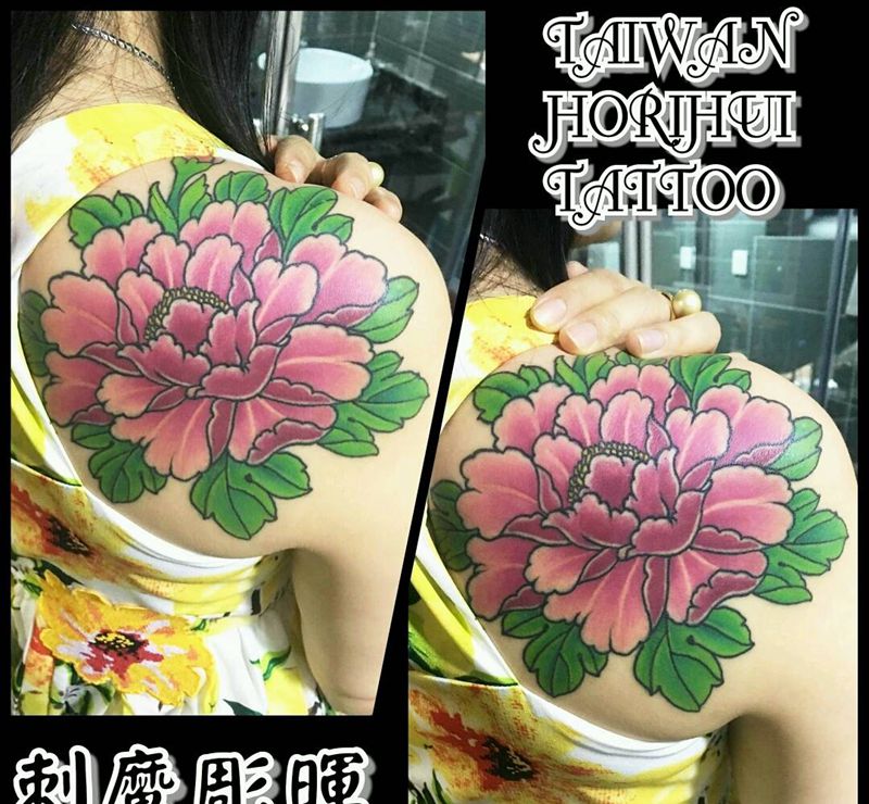 牡丹花~臺灣刺魔彫暉刺青纹身图片_肩部传统植物成品纹身图案