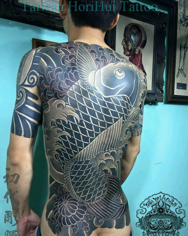 後背鯉魚水浪~臺灣刺魔彫暉刺青纹身图片_背部传统动物成品纹身图案