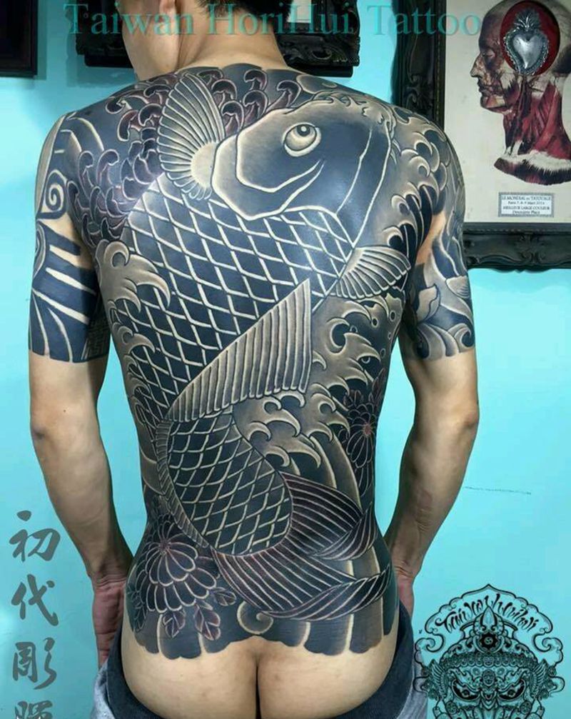 後背鯉魚水浪~臺灣刺魔彫暉刺青纹身图片_背部传统动物成品纹身图案