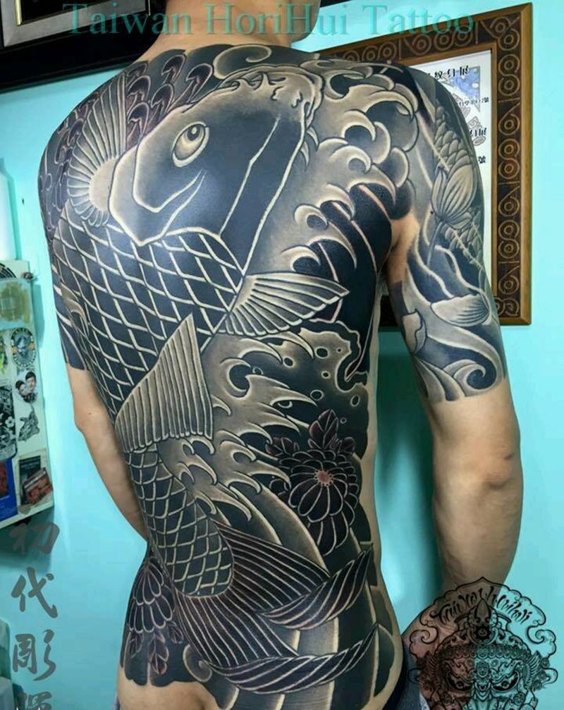 後背鯉魚水浪~臺灣刺魔彫暉刺青纹身图片_背部传统动物成品纹身图案
