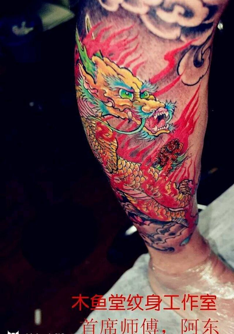 • T网红王老大花腿龙纹身图片_腿部新传统纹身图案