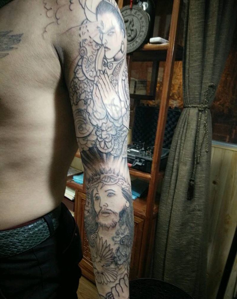 当前位置: 首页 >江苏省苏州市纹身店-昆山木鱼堂纹身工作室纹身图案>黑白花臂纹身图片_肩部手臂传统人物纹身图案