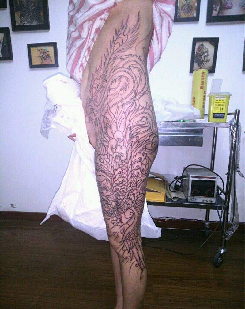 当前位置: 首页 >江苏省苏州市纹身店-昆山木鱼堂纹身工作室纹身图案>凤凰包腿,等待上色中纹身图片