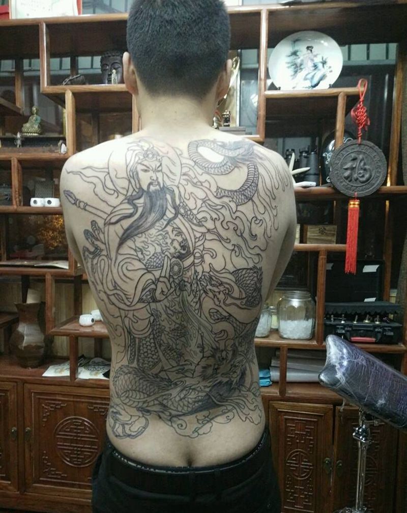 当前位置: 首页 >江苏省苏州市纹身店-昆山木鱼堂纹身工作室纹身图案>传统关公线条纹身图片
