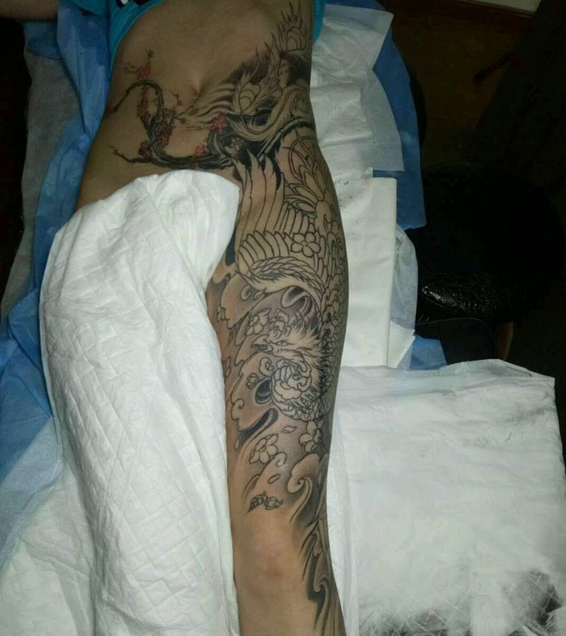 当前位置: 首页 >江苏省苏州市纹身店-昆山木鱼堂纹身工作室纹身图案>凤凰包腿纹身图片