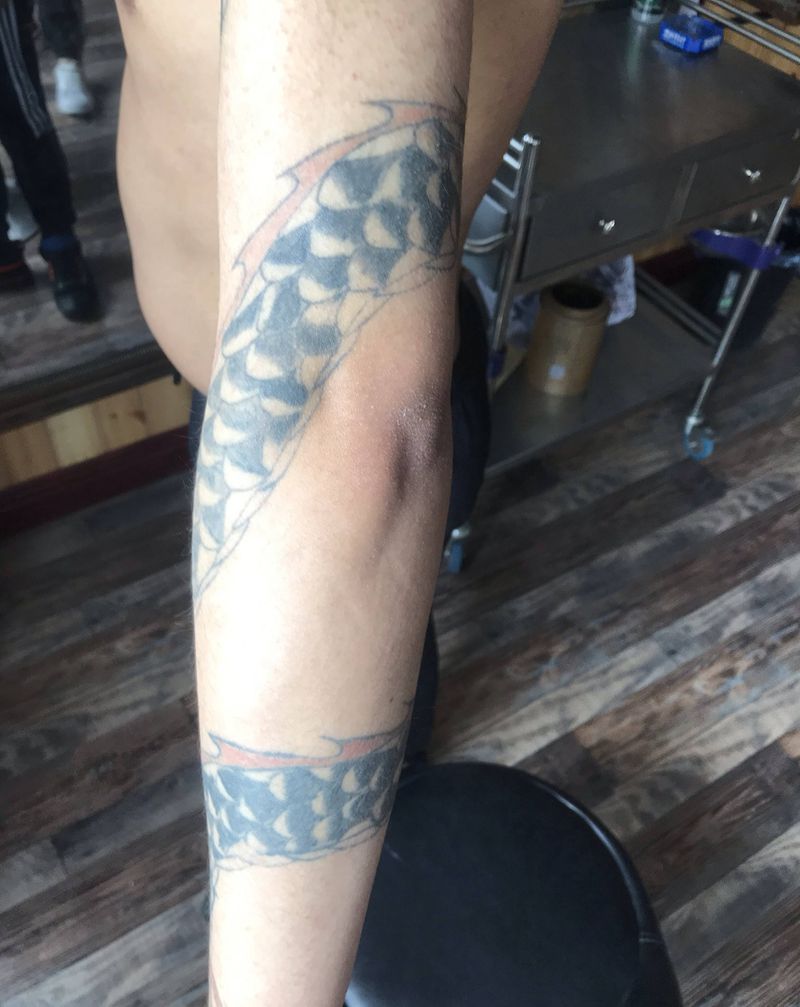当前位置: 首页 >江苏省苏州市纹身店-昆山木鱼堂纹身工作室纹身图案>花臂龙遮盖老式过肩龙纹身图片_手臂新传统纹身图案