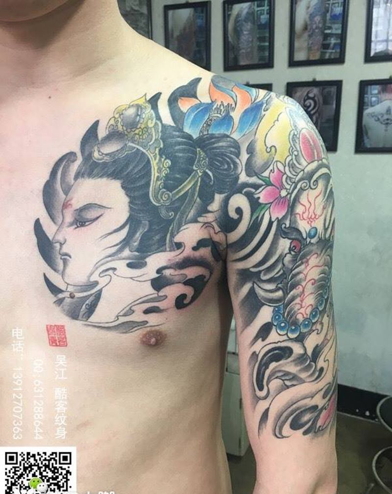 当前位置: 首页 >江苏省苏州市纹身店-吴江酷客纹身纹身图案>半甲纹身图案纹身图片_成品胸部手臂肖像传统人物动物纹身图案