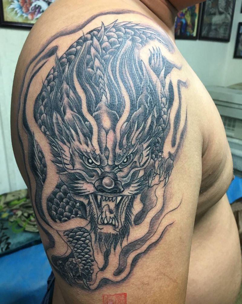 • T网红王老大花腿龙纹身图片_腿部新传统纹身图案