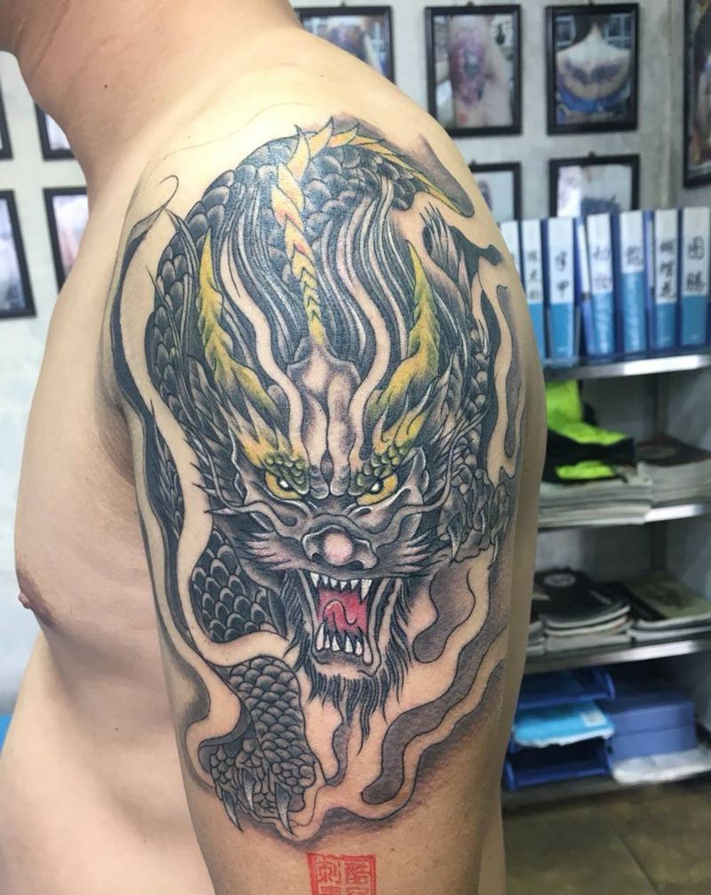 • T网红王老大花腿龙纹身图片_腿部新传统纹身图案