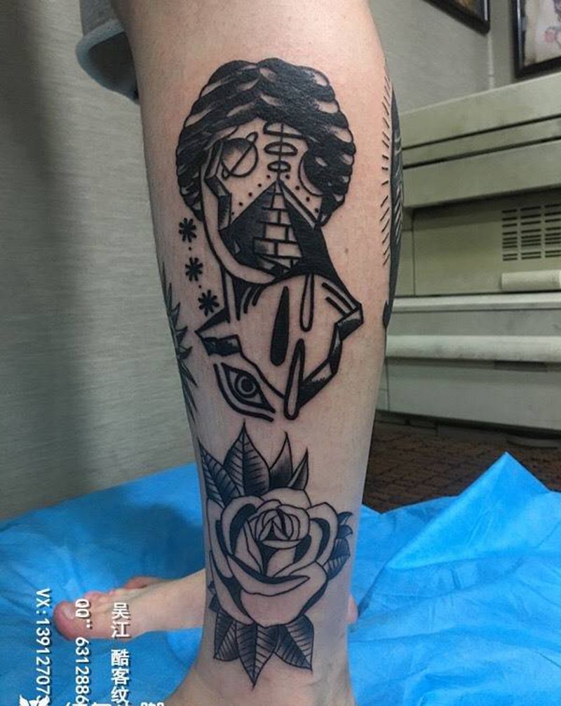 • T包小腿吹火男+阿多福纹身图片_腿部老传统新传统吹火男阿