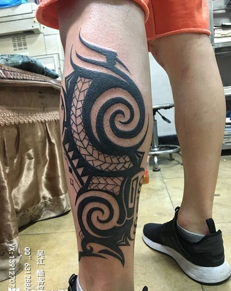 • T网红王老大花腿龙纹身图片_腿部新传统纹身图案