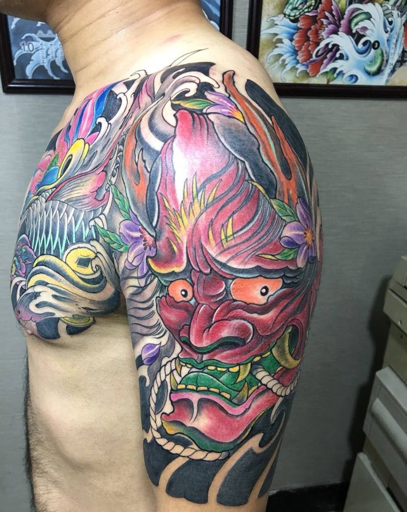 半甲纹身图片_成品胸部手臂传统鬼神动物纹身图案