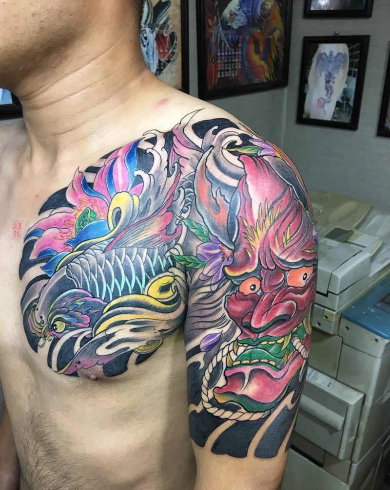 半甲纹身图片_成品胸部手臂传统鬼神动物纹身图案