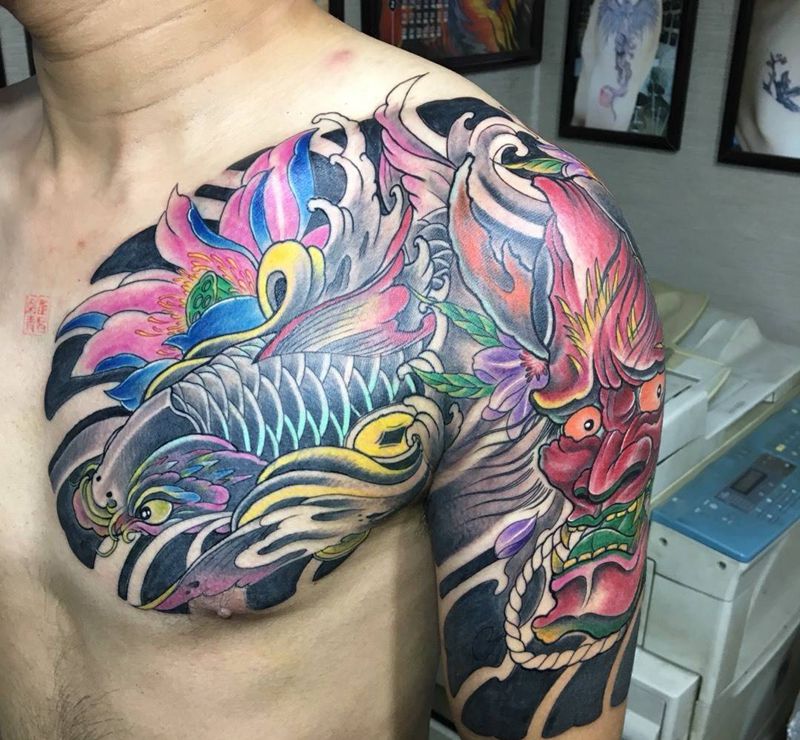 半甲纹身图片_成品胸部手臂传统鬼神动物纹身图案