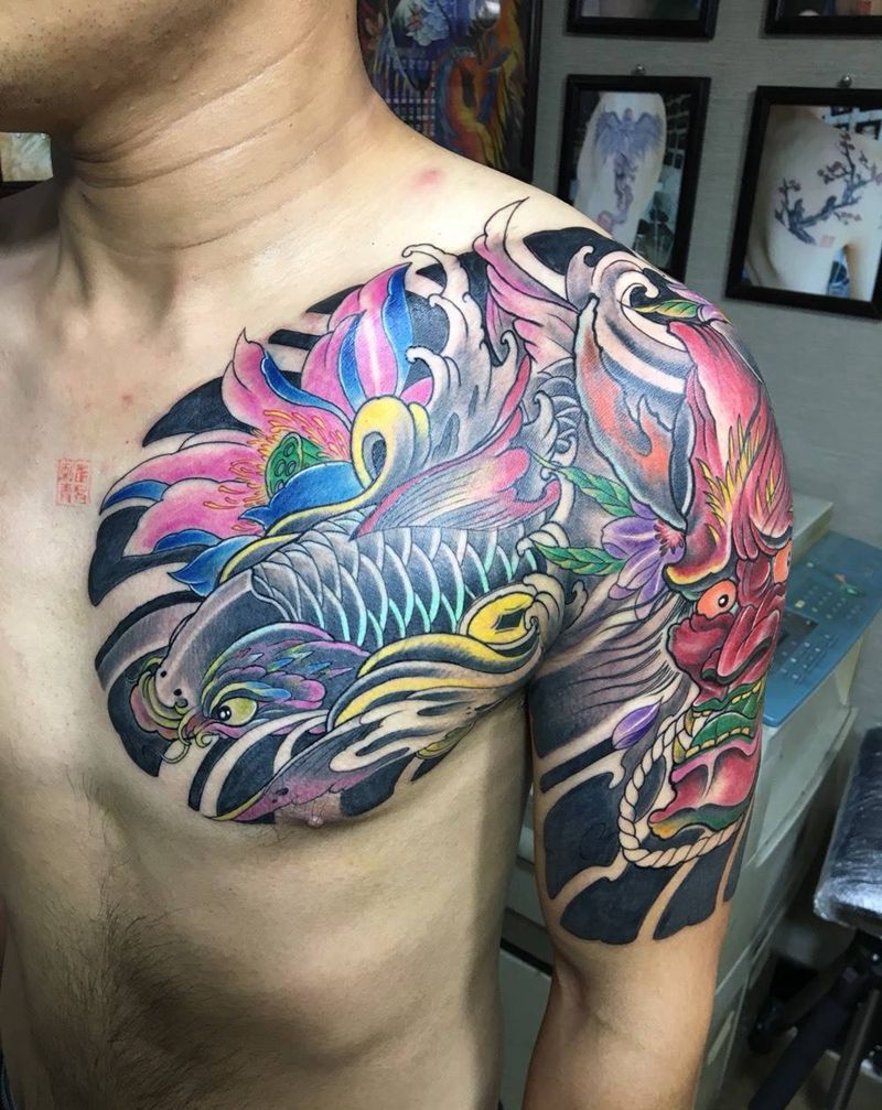半甲纹身图片_成品胸部手臂传统鬼神动物纹身图案