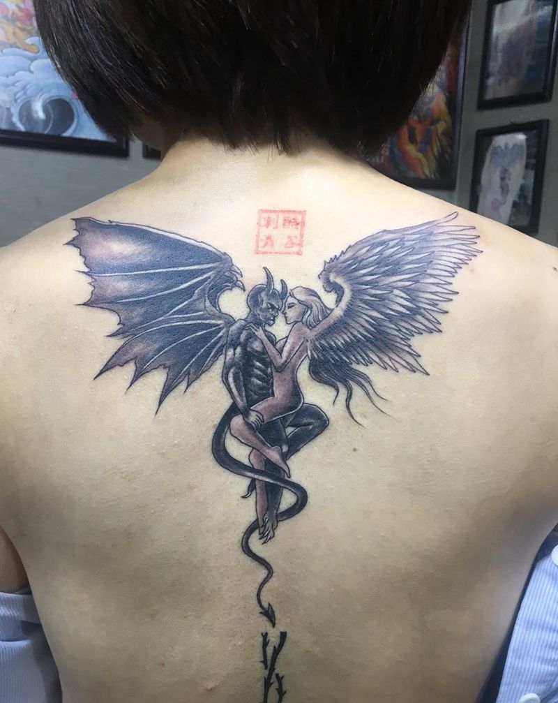 天使与恶魔纹身图片_背部新传统纹身图案