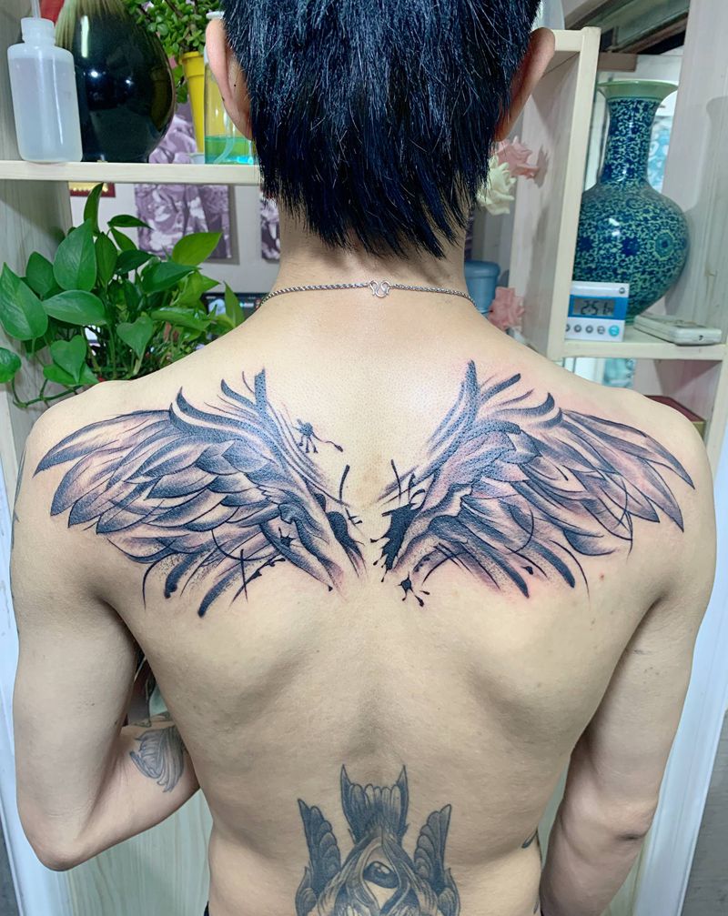 翅膀纹身图片_背部新传统纹身图案