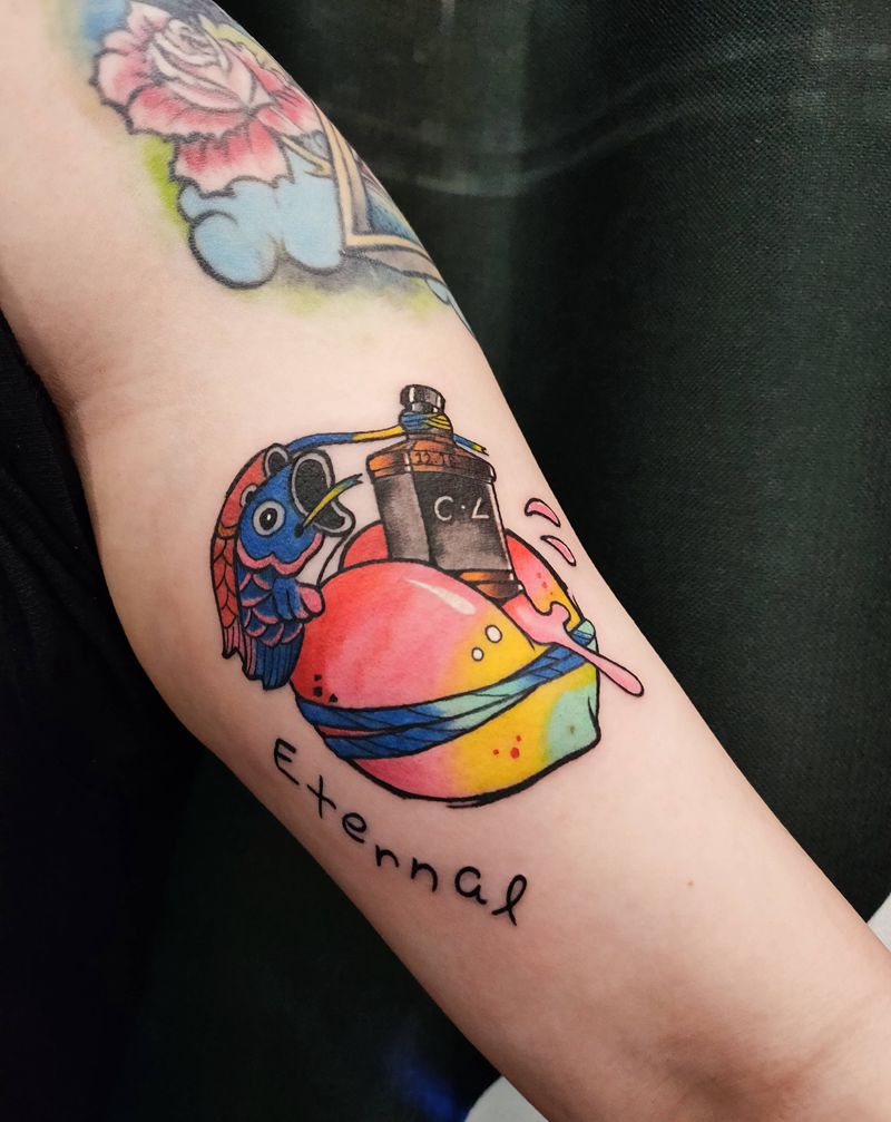 当前位置: 首页 >江苏省苏州市纹身店-七渡刺青艺术馆纹身图案>蜜桃纹身图片_手臂New School纹身图案