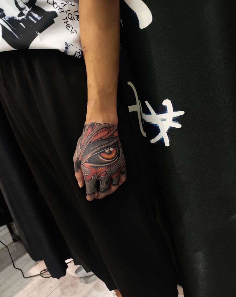 当前位置: 首页 >江苏省苏州市纹身店-七渡刺青艺术馆纹身图案>眼镜纹身图片_手部New School欧美写实眼睛花拳纹身图案
