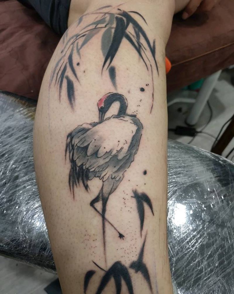 当前位置: 首页 >江苏省苏州市纹身店-七渡刺青艺术馆纹身图案>鹤纹身图片_腿部新传统仙鹤国画纹身图案