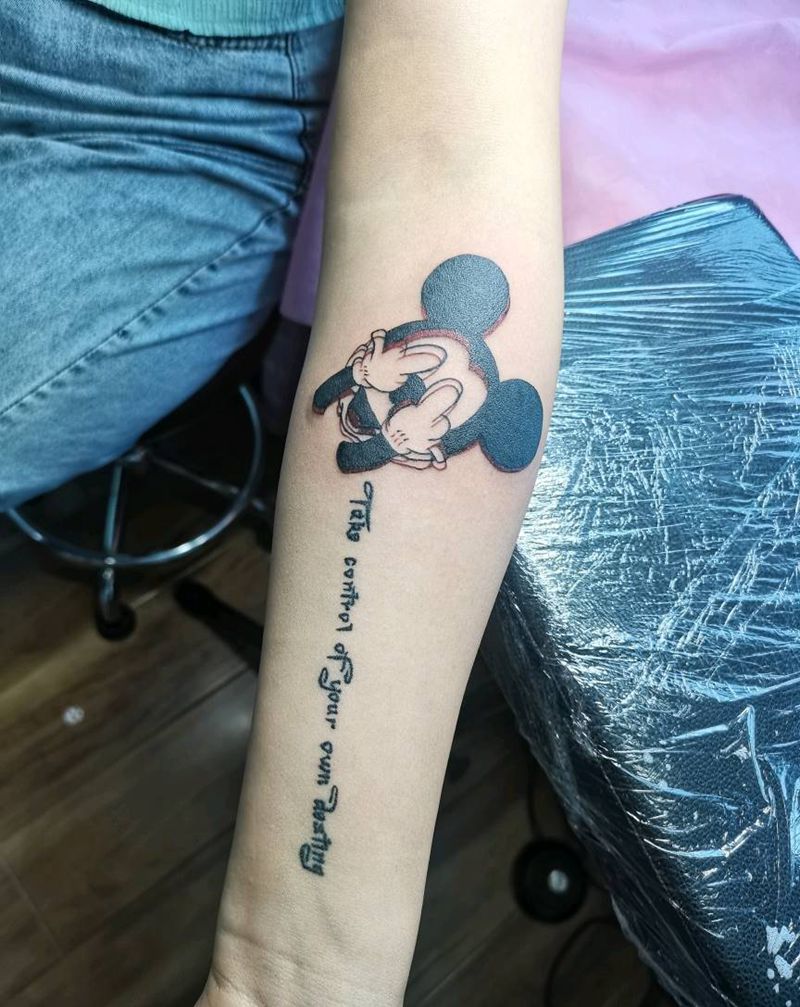 竖中指的米老鼠纹身图片_手臂纹身图案