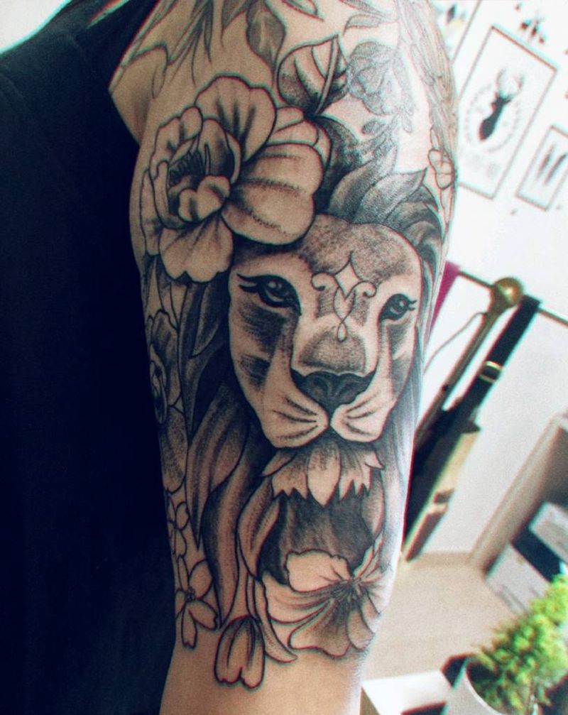 当前位置: 首页 >江苏省连云港市纹身店-皇嘉刺青纹身图案>狮子花朵拼接纹身图片_手臂欧美写实点刺清新纹身图案