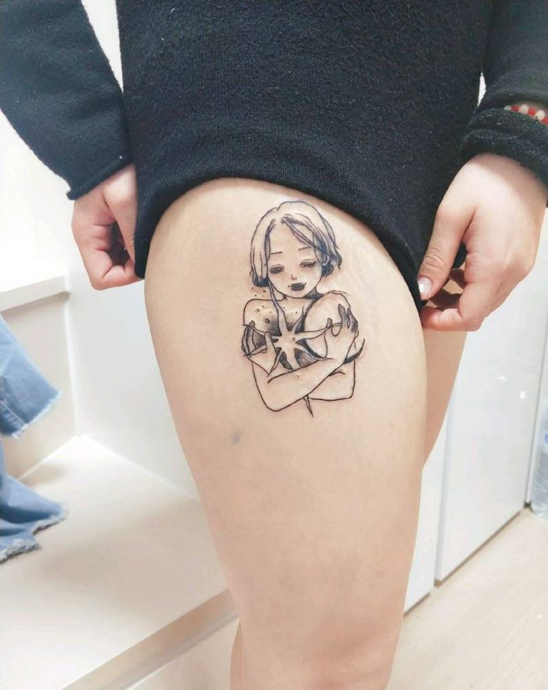治愈系小女孩纹身图片_腿部清新纹身图案