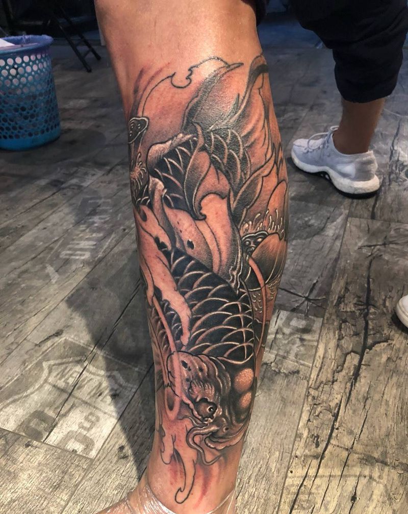 • T网红王老大花腿龙纹身图片_腿部新传统纹身图案