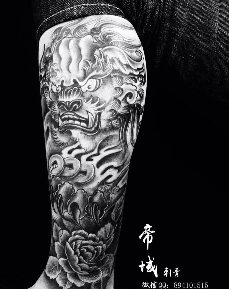 当前位置: 首页 >江苏省宿迁市纹身店-帝域刺青纹身图案>小腿唐狮遮盖疤痕,纹身图片